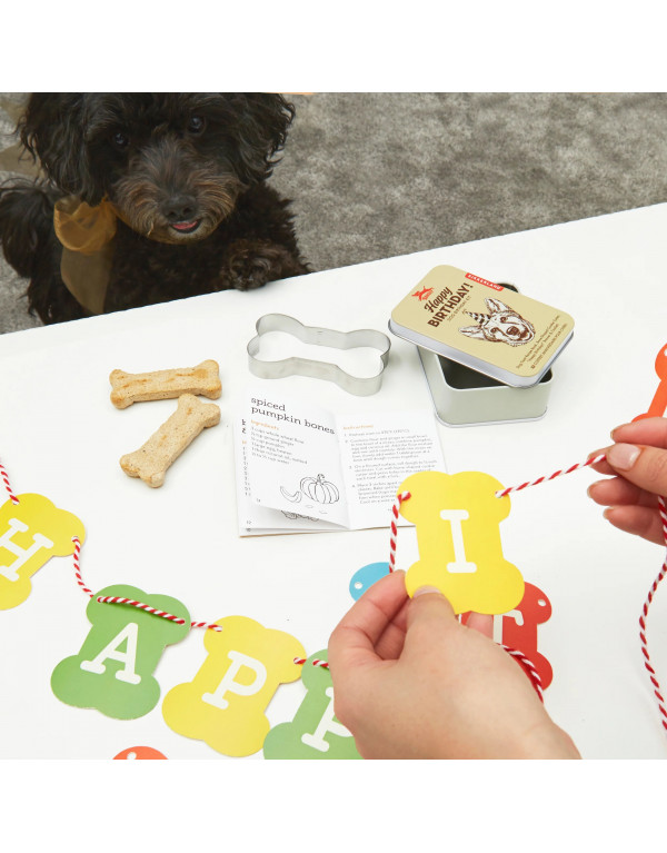 Contient un livre de recettes pour chien, un emporte-pièce en forme d'os, un chapeau d'anniversaire, ainsi qu'une guirlande et des confettis.