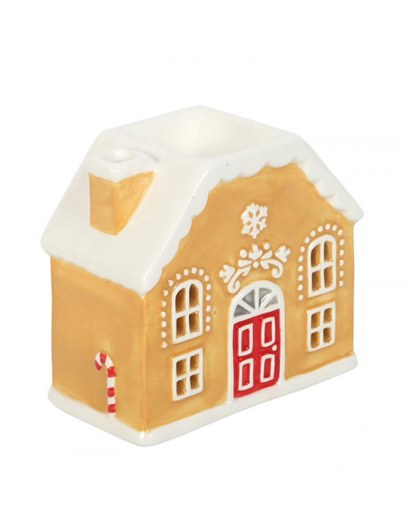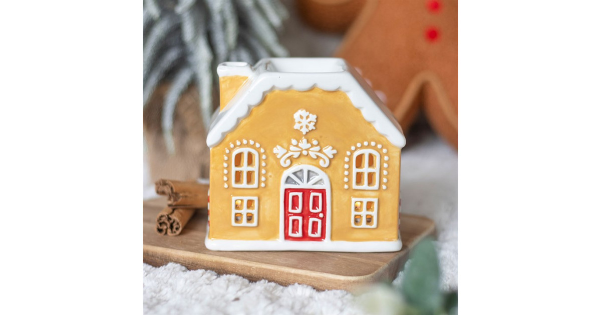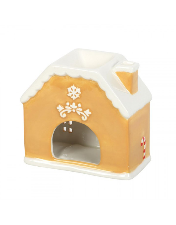 Brûleur en forme de maison de pain d'épices. Sa coupelle accueille la cire parfumée (fondant), les huiles essentielles, le parfum ou toute autre solution parfumée. Sa conception permet de placer facilement une bougie chauffe-plat à l’intérieur : la chaleur douce diffuse les senteurs sans les altérer, tandis que les ouvertures arrondies laissent apparaître un jeu de lumière apaisant.