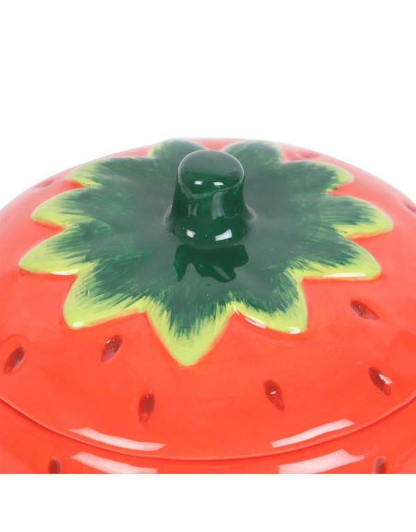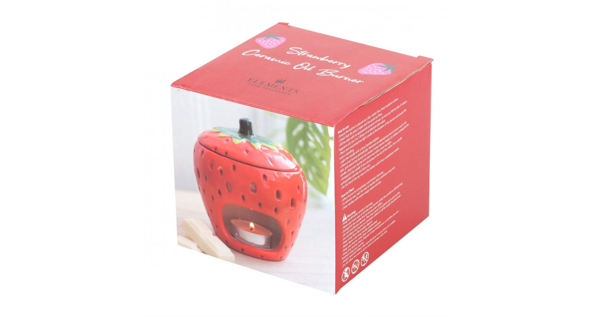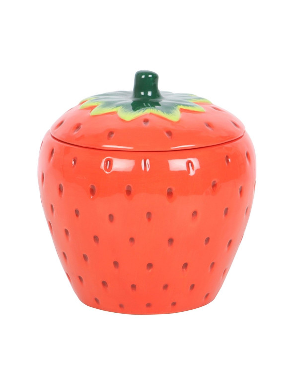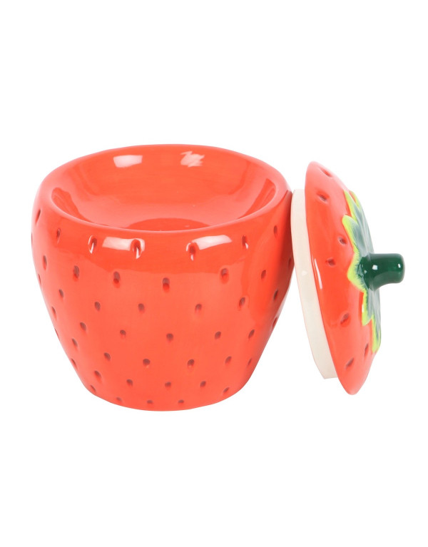 Brûleur en forme de fraise. Sa coupelle accueille la cire parfumée (fondant), les huiles essentielles, le parfum ou toute autre solution parfumée. Sa conception permet de placer facilement une bougie chauffe-plat à l’intérieur : la chaleur douce diffuse les senteurs sans les altérer, tandis que les ouvertures arrondies laissent apparaître un jeu de lumière apaisant.