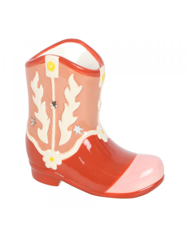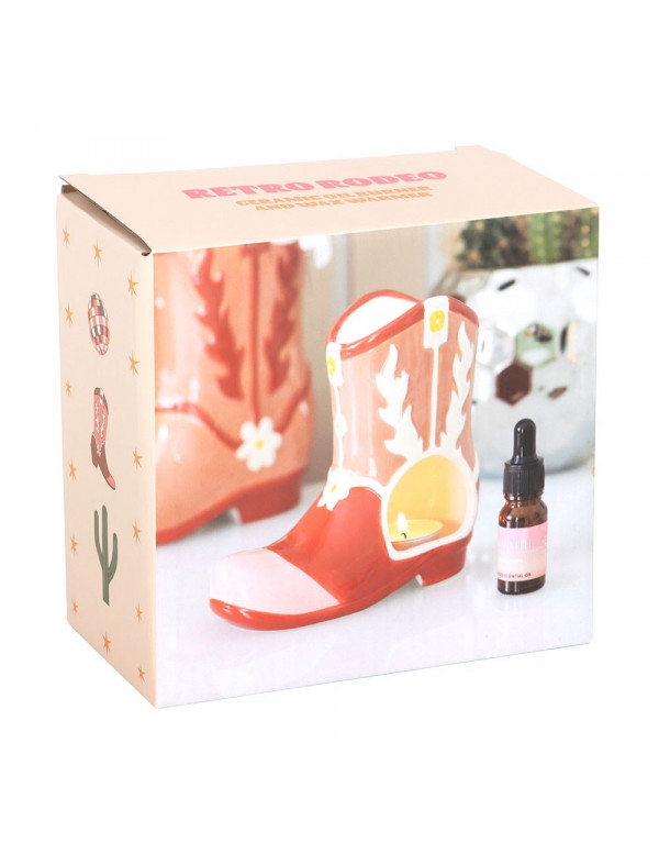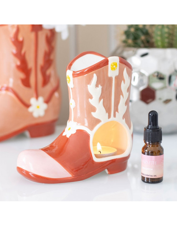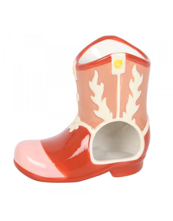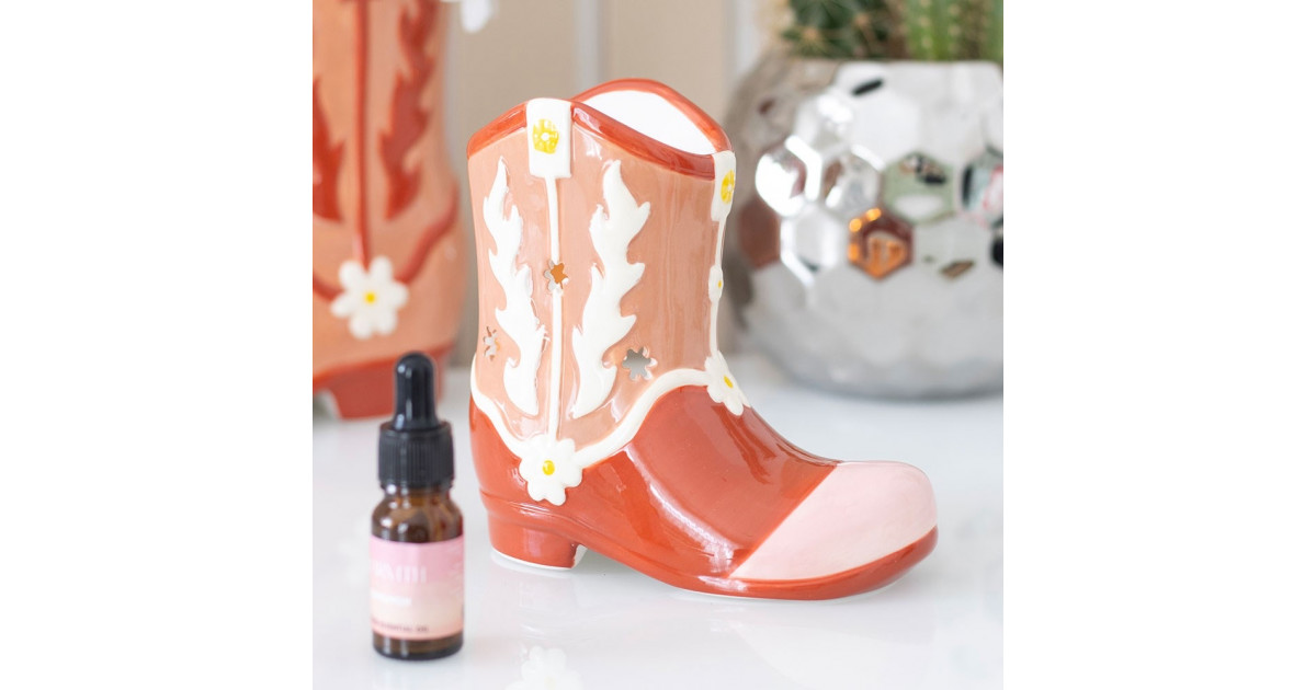 Brûleur en forme de botte de cowboy / santiag. Sa coupelle accueille la cire parfumée (fondant), les huiles essentielles, le parfum ou toute autre solution parfumée. Sa conception permet de placer facilement une bougie chauffe-plat à l’intérieur : la chaleur douce diffuse les senteurs sans les altérer, tandis que les ouvertures arrondies laissent apparaître un jeu de lumière apaisant.