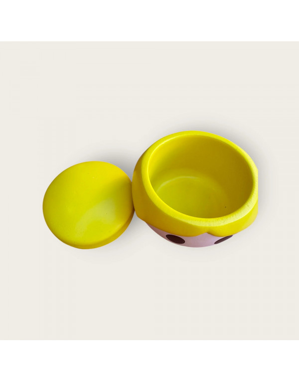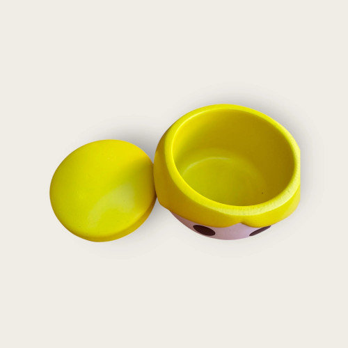 Fabriqué dans un matériau solide, il se divise en deux parties : la tête souriante sert de récipient, et la coiffure bombée de couvercle pratique.