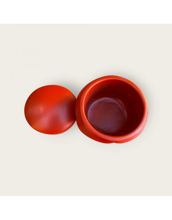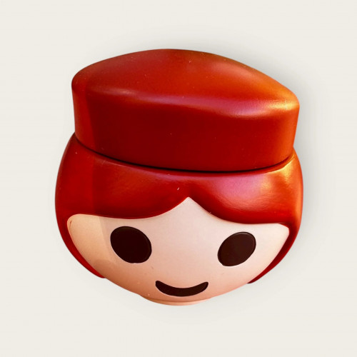 Fabriqué dans un matériau solide, il se divise en deux parties : la tête souriante sert de récipient, et la coiffure bombée de couvercle pratique.