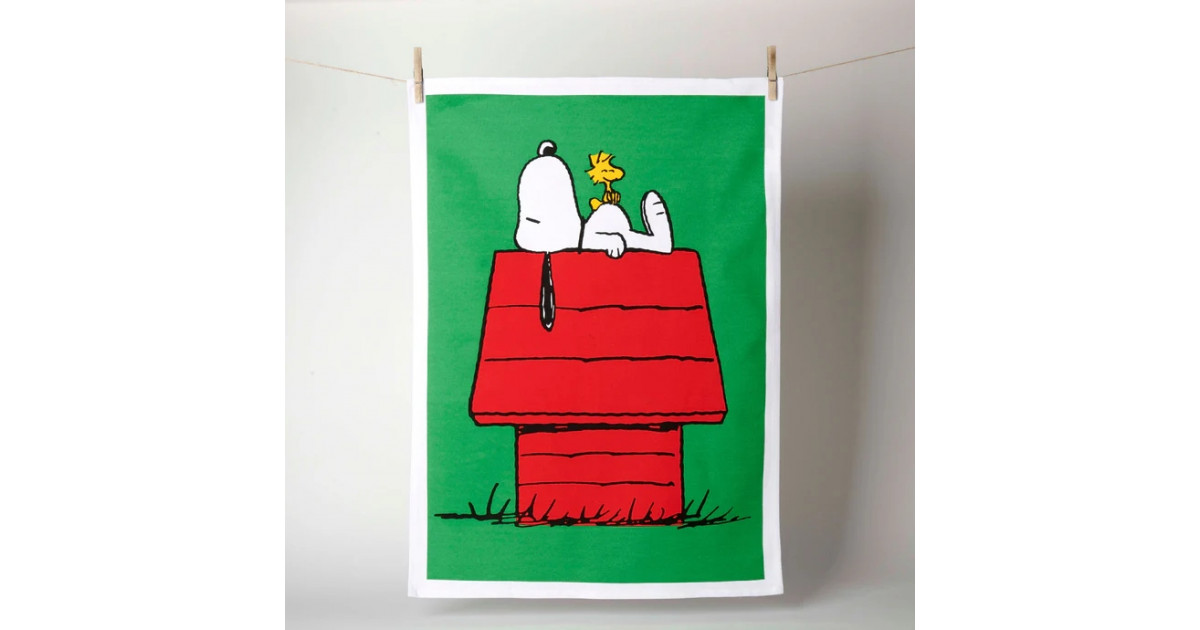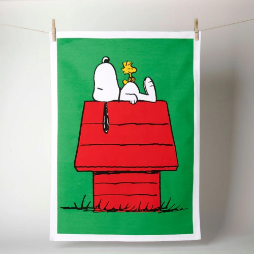 Essuie vaisselle avec Snoopy couché sur sa niche.