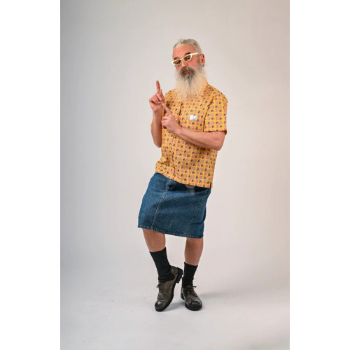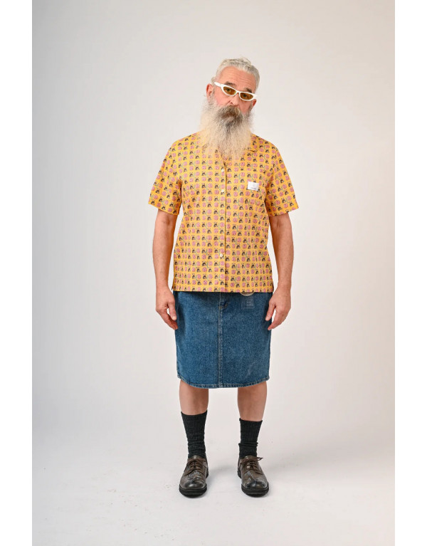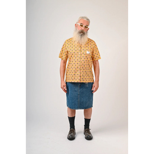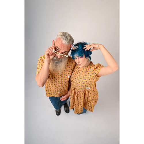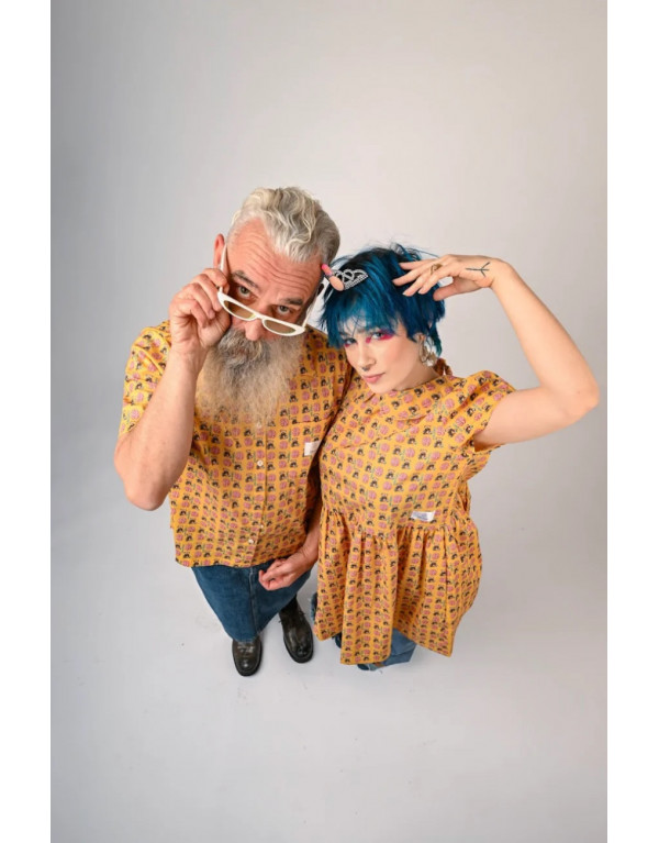 Dessins de petits oursons et de cerveaux sur un fond de couleur moutarde.